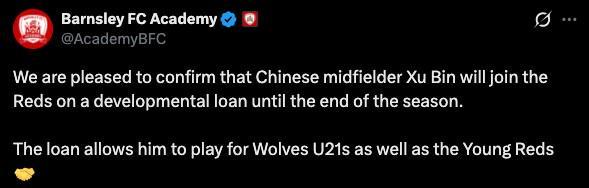 巴恩斯利青训学院的官方公告是:“我们很高兴地确认,中国中场球员徐彬将作为发展性租借球员加盟巴恩斯利,租借期将持续至本赛季结束。这笔租借将允许他同时代表狼队U21及巴恩斯利青年队出战。”